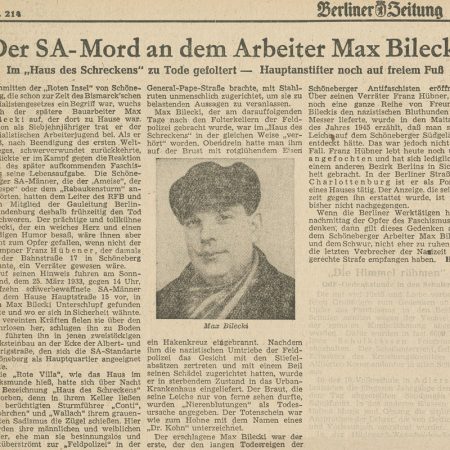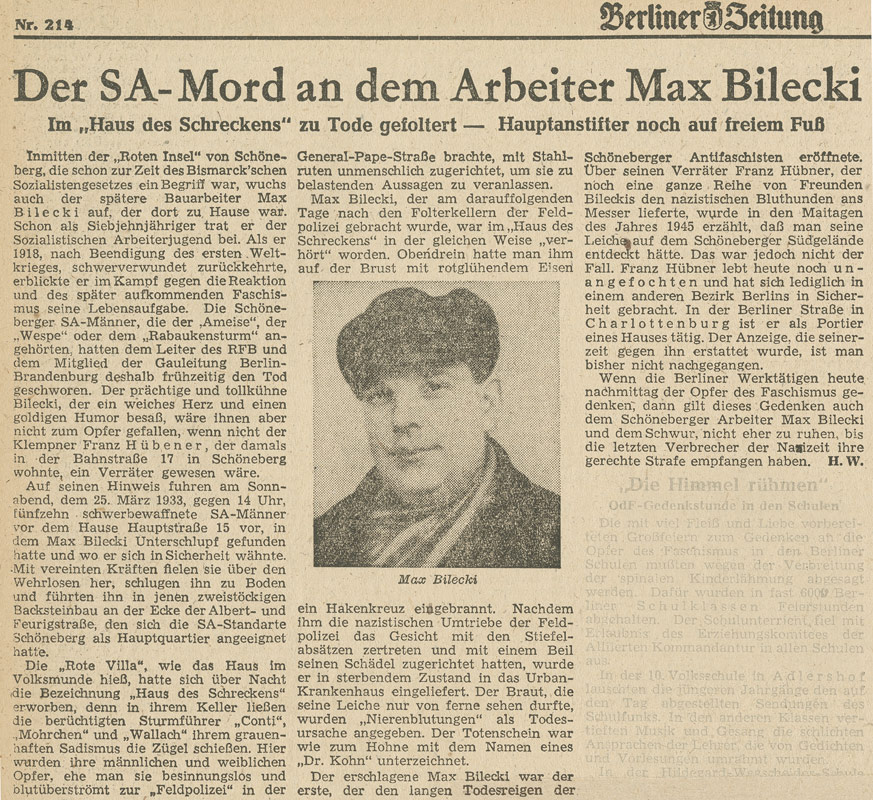 Dem Klempner Franz Hübner wurde vorgeworfen, als ehemaliges KPD-Mitglied die SA-Feldpolizisten bei der Suche und Identifizierung zu verhaftender Personen unterstützt zu haben. Die Richter verhängten 1949 eine Strafe von zwölf Jahren Zuchthaus.